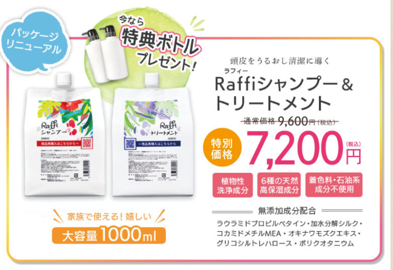 かゆみ、フケ、パサつき解消!口コミで話題のラフィーシャンプーが特別価格
