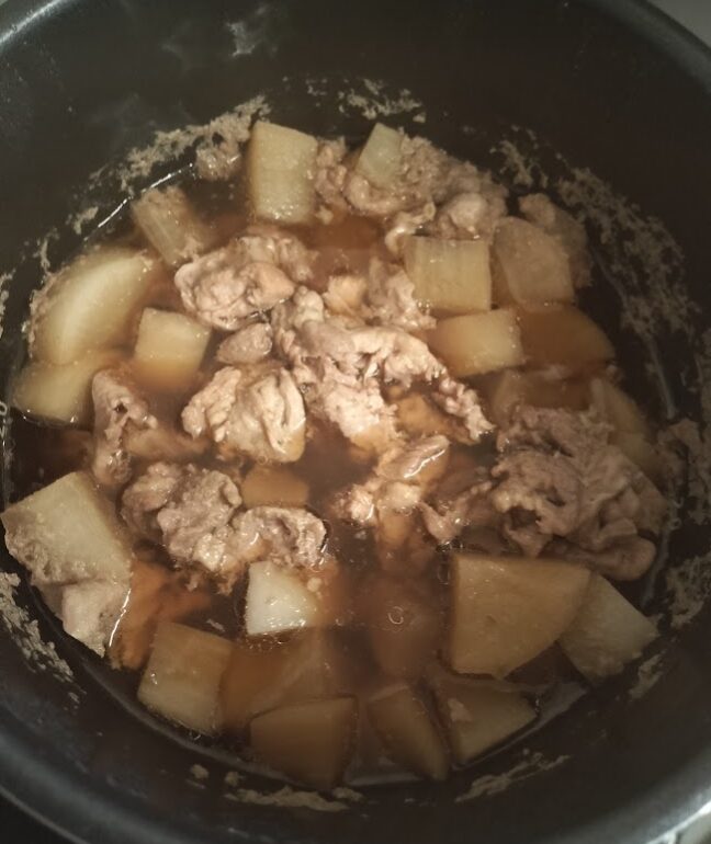 下の写真は、アイリスオーヤマの電気圧力鍋で、公式レシピの「豚バラ大根」を作った時の写真です。