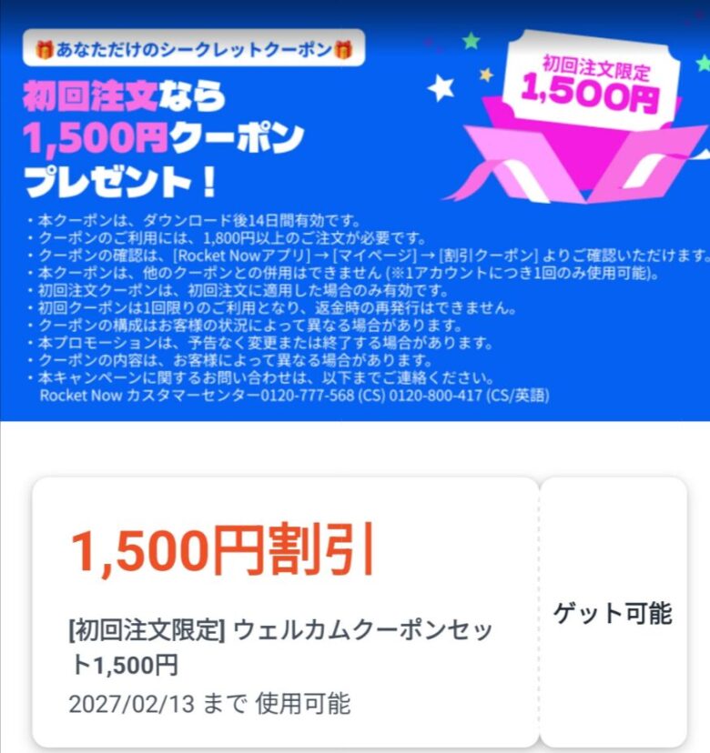 ロケットナウのアプリを初めてダウンロードした全員に、合計で1,500円分の割引が受けられるクーポンがもらえます。(※2026年2月時点)
