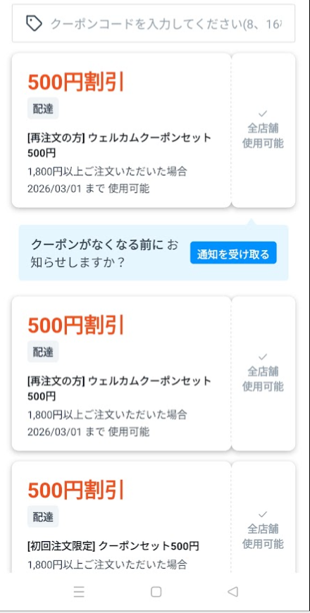 - 一度利用すれば、その後も随時お得なクーポンが届く