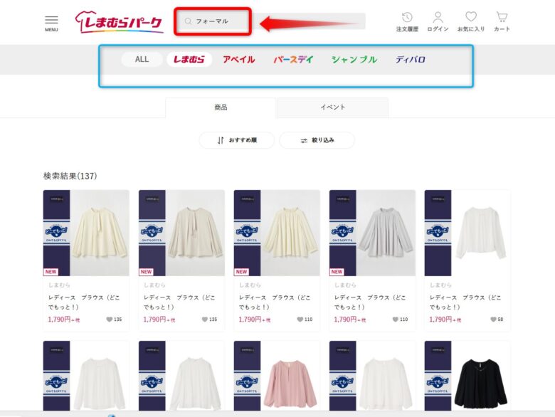 「フォーマル」と検索すると、全グループ店の商品から検索できます。しまむらだけから探すなどの抽出も可能です。