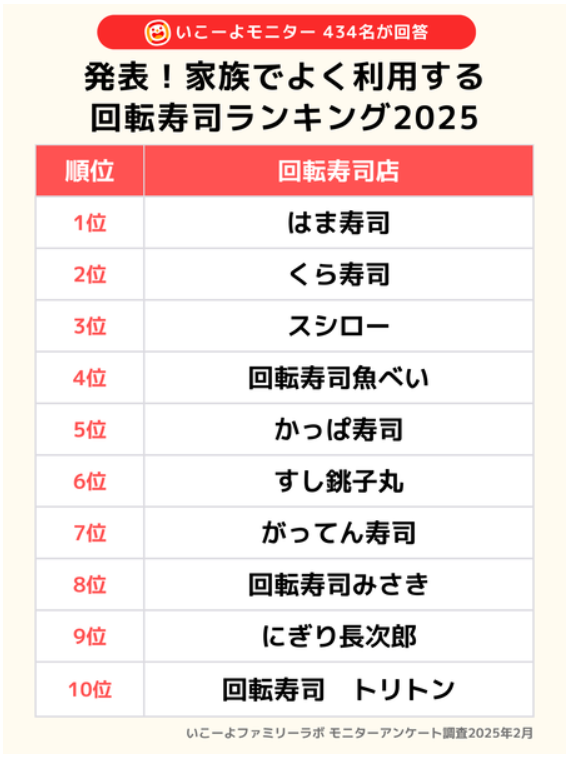 がしかし、「いこーよ」が434名に取ったアンケートによる、「家族でよく利用する回転寿司ランキング2025」の結果は下記です。