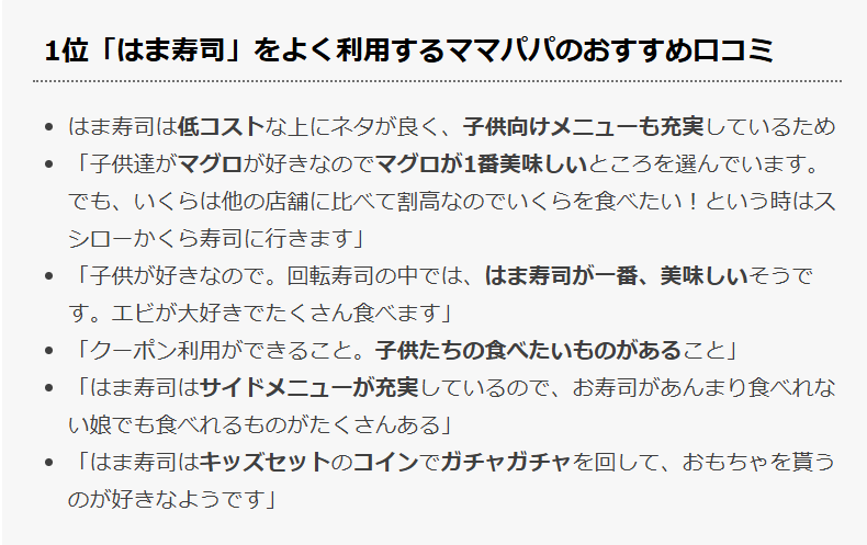 ただ、子供のいるファミリーには、種類が多く、サイドメニューやデザートが充実しているはま寿司の方が人気となっている様です。