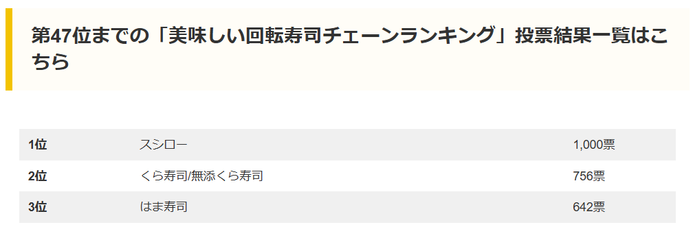 2024年に約8700人から取ったアンケートによる、美味しい回転寿司チェーンランキングの結果は下記です。