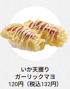 - いか天握りガーリックマヨ:はま寿司のてんぷらはカリカリ感強め、いか柔らかい。