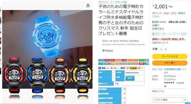 | キッズ向け電子腕時計 | 405 | 2,001 | 1,596 |