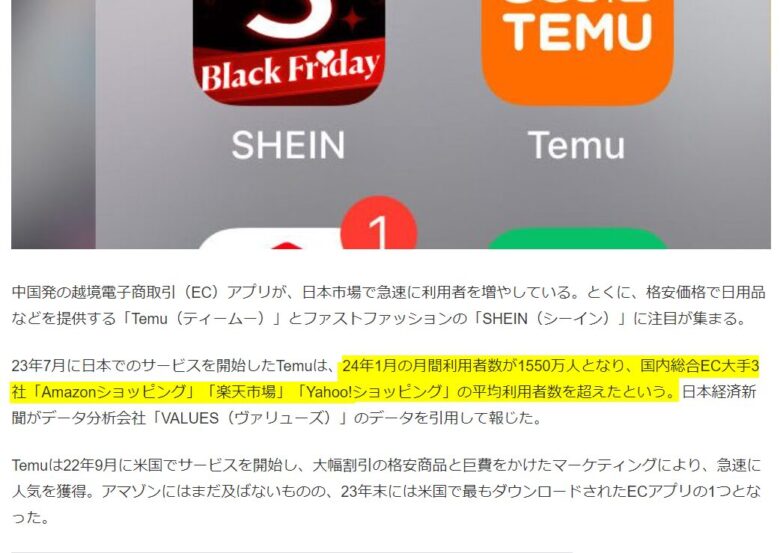 アメリカでは、ショッピングアプリのダウンロード数1位の人気、更に2024年1月には、日本での月間利用者数が1,550万人となり、なんと国内EC大手3社の平均利用者数を超えました。