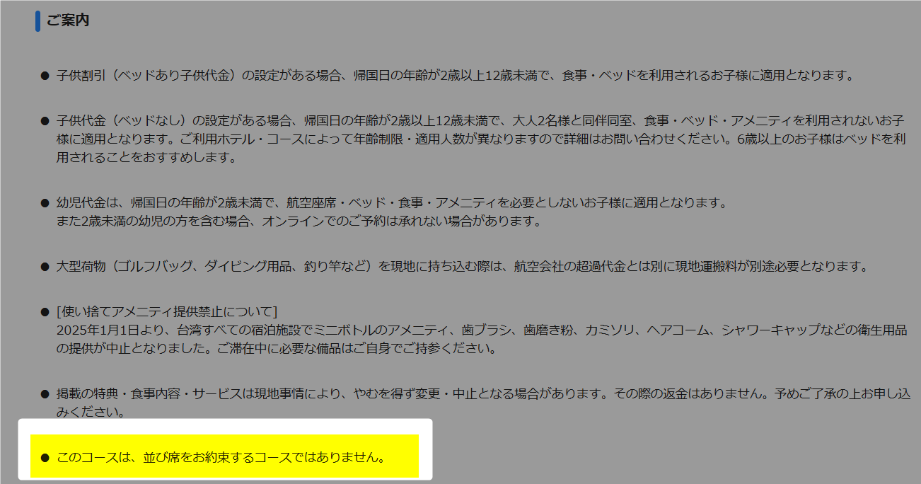 以下の様に、「並び席をお約束するコースではありません」と明記されていることがあります。