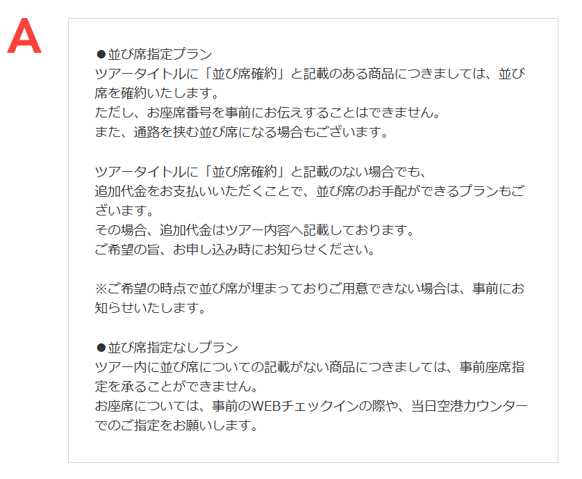 並び席の記載がない商品は旅行会社側では事前指定できず、Webからや、カスタマーセンターで自分で手配するように案内があります。