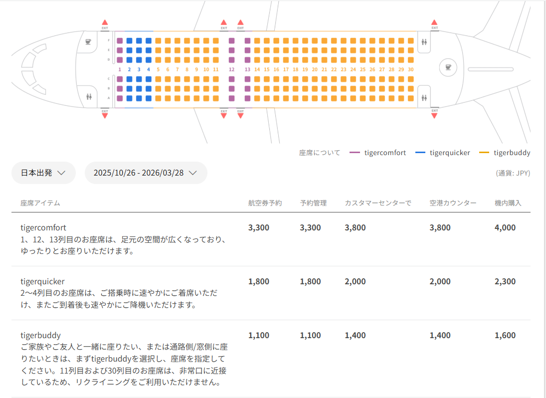 タイガーエアを利用するパッケージツアーでは、座席指定のルールは旅行会社ごとに異なります。