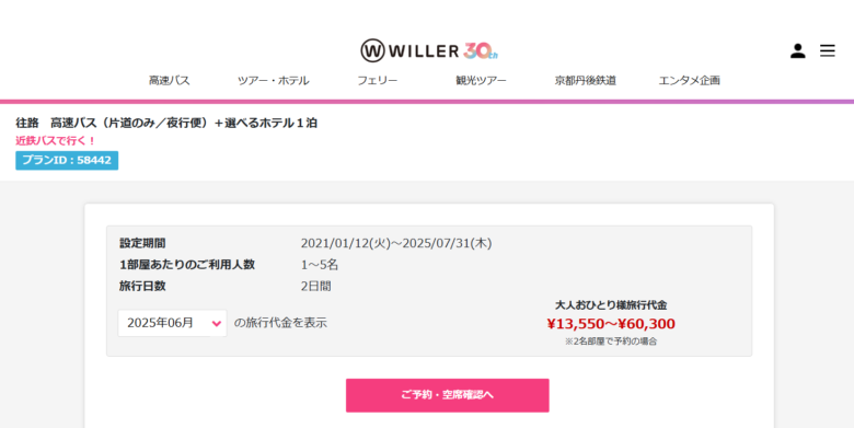WILLER TRAVEL(往復バス+1泊で13,000円~)