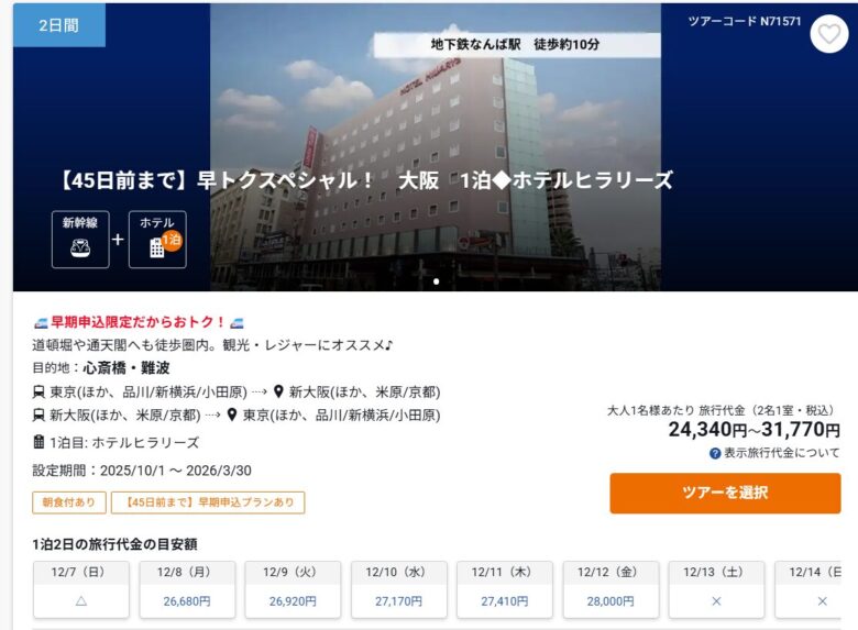 宿泊とセットなら、新幹線と同じく、セットになったプランやツアーを利用する方が断然得です。