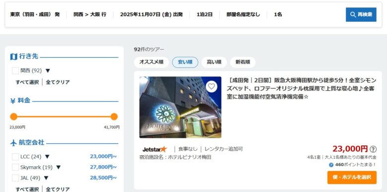 例えば、11月の平日(金曜日)で成田から関空の往復とホテル1泊でなんと、23,000円~ありました。