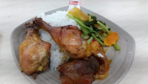 地元民御用達のスーパーのフードコート、どのおかずを盛っても、均一料金。