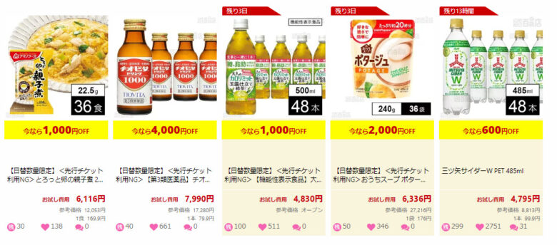 販売数量の単位が多いのが少しデメリットですが、飲料やカップ麺やお菓子等の、比較的期限が長い物ばかりの為、箱買いしても問題ありませんね。