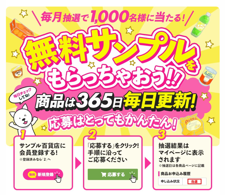 抽選で賞品が当たる【無料サンプルもらっちゃお】というのがあります。