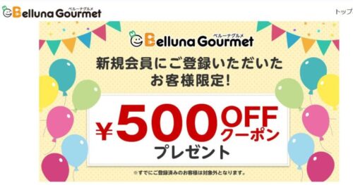さらに、ベルーナグルメで会員登録すると、初めてのお買い物で500円引きになるクーポンがもらえます。