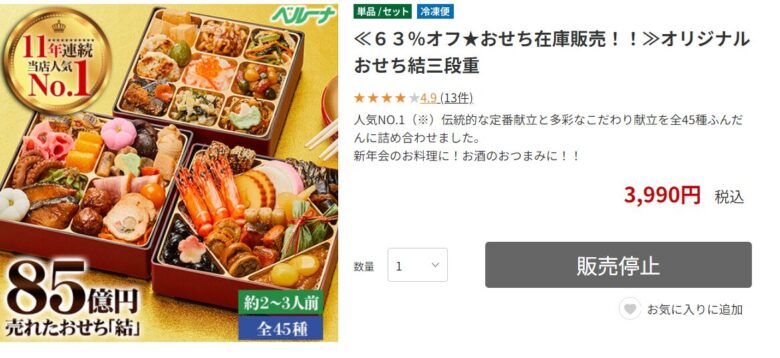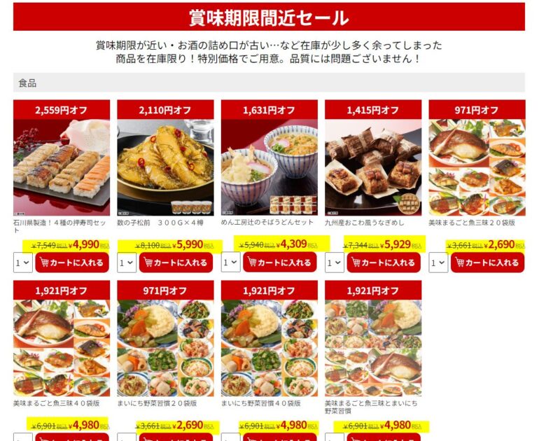 - 日本酒・おせち・総菜などに強み(例:おせちセット 3,990円(63%OFF))