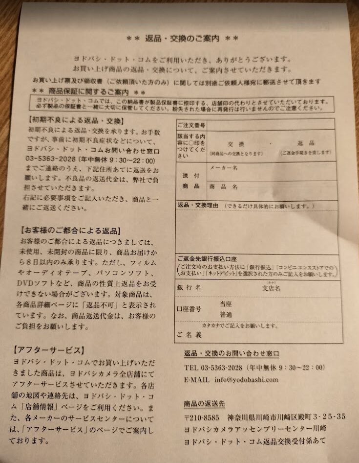 ヨドバシカメラ納品書(裏面)返品・交換の案内