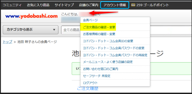 「こんにちは ○○様 」の名前にカーソルを合わせると下記の選択肢が出ます。